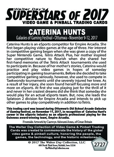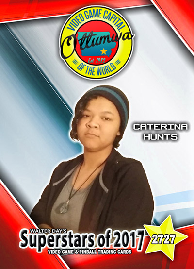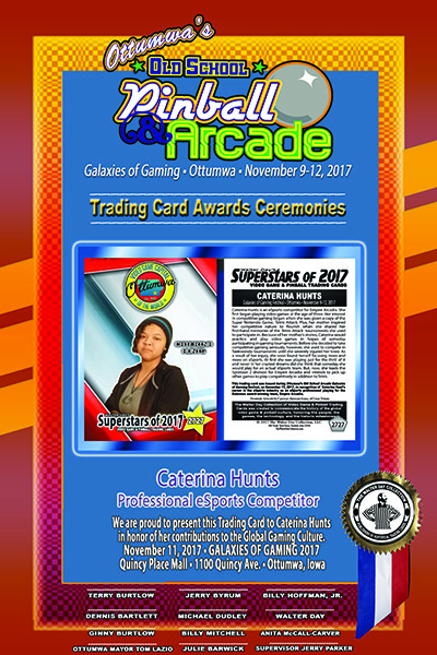 Though not able to attend in person the recent Ottumwa Trading Card Ceremonies, Caterina Hunts was recognized as being a member of the elite group of video game luminaries from Empire Arcadia who were honored on trading cards for their important contributions to the global gaming culture. Their trading cards were presented by Billy MItchell and Walter Day -- along with the AWARD CERTIFICATE shown below -- on Saturday, November 11, 2017, during the Ottumwa Old School Arcade Galaxies of Gaming Festival, at the Quincy Place Mall, in Ottumwa, Iowa. To see the other trading cards unveiled during this ceremony -- or to see the long chronological history of the TRADING CARDS AWARDS TRADITION, go to this link: Chronological History of the Trading Card Awards Ceremonies