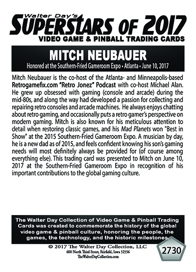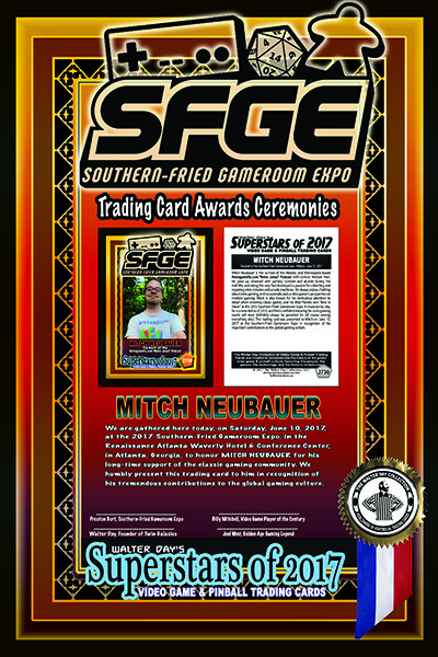 This card and award were presented to Mitch Neubauer during the 2017 Southern-Fried Gameroom Expo, Atlanta, GA, June 10, 2017. Mitch was recognized for his historic work on the Retro Jonez Podcast.