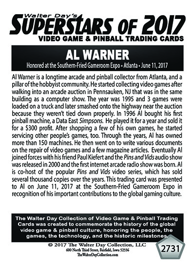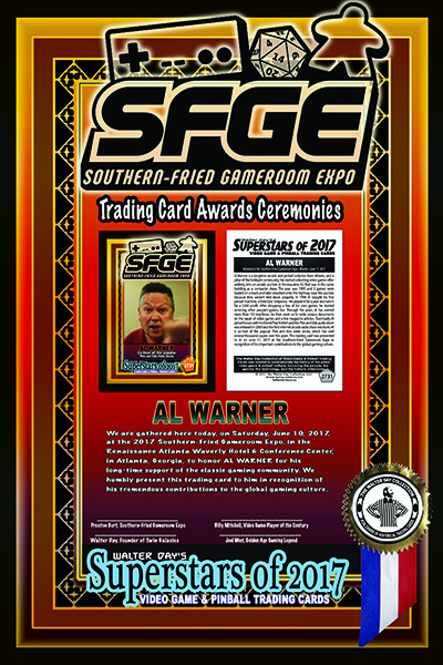 This card and award were presented to Al Warner during the 2017 Southern-Fried Gameroom Expo, Atlanta, GA, June 10, 2017. Al was recognized for his historic work on the Pins and Vids Video Series.