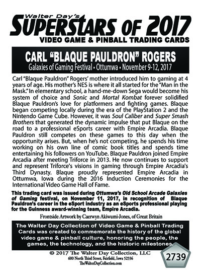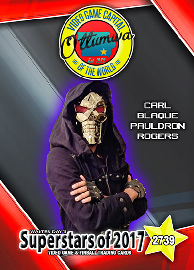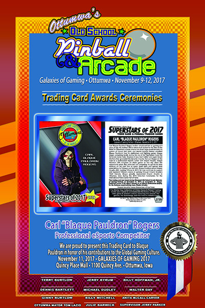 During the recent Ottumwa Trading Card Ceremonies, Carl "Blaque Pauldron" Rogers was among an elite group of video game luminaries from Empire Arcadia who were honored on trading cards for their important contributions to the global gaming culture. Their trading cards were presented by Billy MItchell and Walter Day -- along with the AWARD CERTIFICATE shown below -- on Saturday, November 11, 2017, during the Ottumwa Old School Arcade Galaxies of Gaming Festival, at the Quincy Place Mall, in Ottumwa, Iowa. To see the other trading cards unveiled during this ceremony -- or to see the long chronological history of the TRADING CARDS AWARDS TRADITION, go to this link: Chronological History of the Trading Card Awards Ceremonies