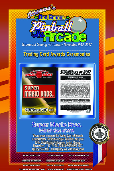 During the recent Ottumwa Trading Card Ceremonies, Super Mario Bros. was among an elite group of video game luminaries who were inducted into the International Video Game Hall of Fame (IVGHOF) Class of 2016, and were also honored on trading cards for their important contributions to the global gaming culture. Presented by Billy MItchell and Walter Day, the trading card was unveiled -- along with an AWARD CERTIFICATE shown herein -- on Saturday, November 11, 2017, during the Ottumwa Old School Arcade Galaxies of Gaming Festival, at the Quincy Place Mall, in Ottumwa, Iowa. To see the other trading cards unveiled during this ceremony -- or to see the long chronological history of the TRADING CARDS AWARDS TRADITION, go to this link: Chronological History of the Trading Card Awards Ceremonies