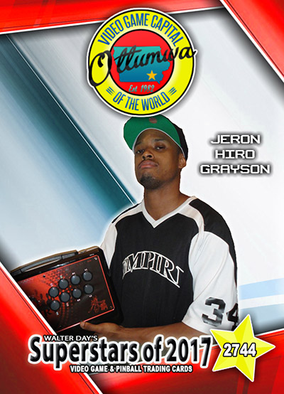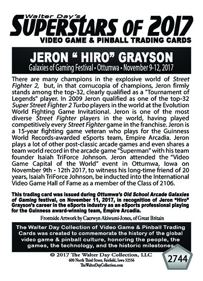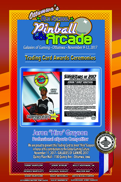 During the recent Ottumwa Trading Card Ceremonies, Jeron Hiro Grayson was among an elite group of video game luminaries from Empire Arcadia who were honored on trading cards for their important contributions to the global gaming culture. Their trading cards were presented by Billy MItchell and Walter Day -- along with the AWARD CERTIFICATE shown below -- on Saturday, November 11, 2017, during the Ottumwa Old School Arcade Galaxies of Gaming Festival, at the Quincy Place Mall, in Ottumwa, Iowa. To see the other trading cards unveiled during this ceremony -- or to see the long chronological history of the TRADING CARDS AWARDS TRADITION, go to this link: Chronological History of the Trading Card Awards Ceremonies