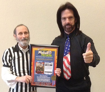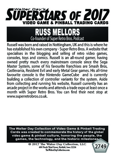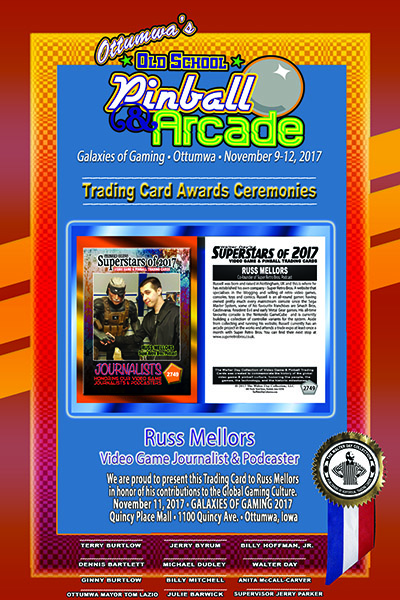 During the recent Ottumwa Trading Card Ceremonies, Russ Mellors was among an elite group of video game journalists who were honored on trading cards for their important contributions to the global gaming culture. Presented by Billy MItchell and Walter Day, the trading card was unveiled -- along with an AWARD CERTIFICATE shown herein -- on Saturday, November 11, 2017, during the Ottumwa Old School Arcade Galaxies of Gaming Festival, at the Quincy Place Mall, in Ottumwa, Iowa.