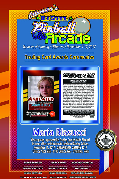During the recent Ottumwa Trading Card Ceremonies, Maria Blasucci was among an elite group of video game champions who were honored on trading cards for their important contributions to the global gaming culture. Presented by Billy MItchell and Walter Day, the trading card was unveiled -- along with an AWARD CERTIFICATE shown herein -- on Saturday, November 11, 2017, during the Ottumwa Old School Arcade Galaxies of Gaming Festival, at the Quincy Place Mall, in Ottumwa, Iowa.