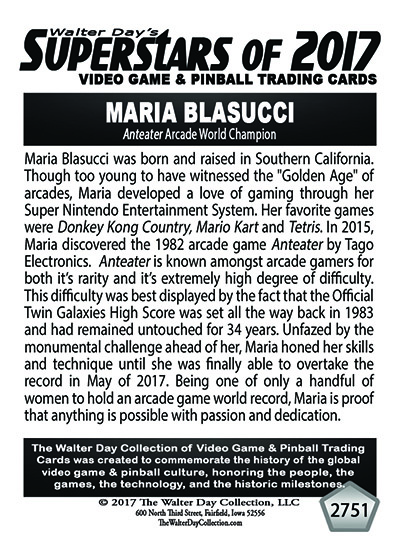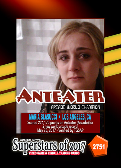 As the world record holder on Anteater, Maria Blasucci has been selected to be one of the featured Twin Galaxies Superstars in this game-specific "High-Score Champions" series of trading cards. This series of trading cards has been reserved only for World Champions whose high scores have been verified by the Twin Galaxies Scoreboard.