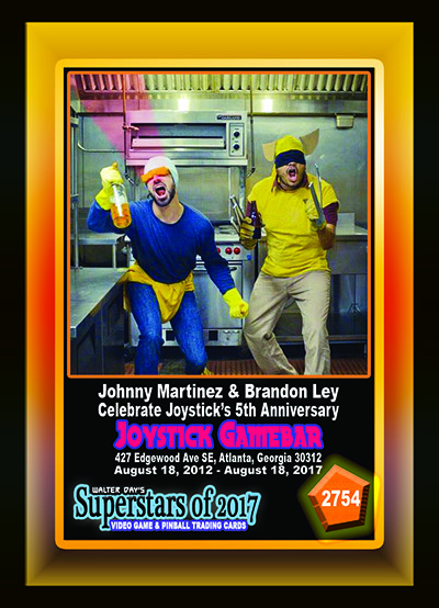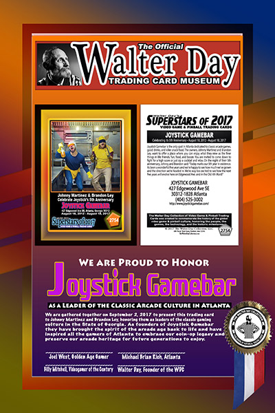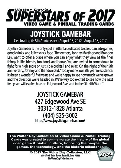 Other Notes: Card #2754, honoring Atlanta's highly esteemed Joystick Gamebar (founded by Johnny Martinez and Brandon Ley) -- was presented (along with an award) at the 2017 Dragon Con, in Atlanta, GA, on September 3, 2017.