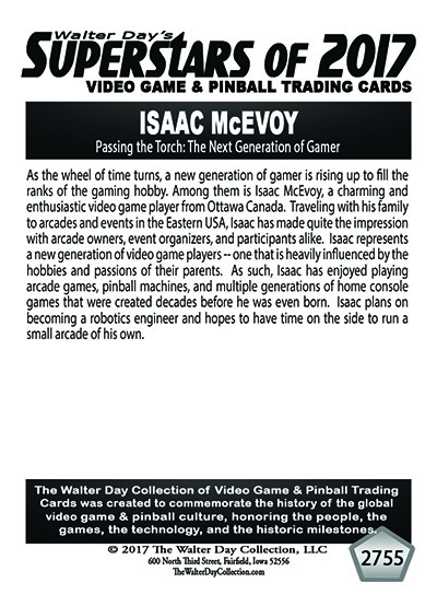 As the wheel of time turns, a new generation of gamer is rising up to fill the ranks of the gaming hobby. Among them is Isaac McEvoy, a charming and enthusiastic video game player from Ottawa Canada. Traveling with his family to arcades and events in the Eastern USA, Isaac has made quite the impression with arcade owners, event organizers, and participants alike. Isaac represents a new generation of video game players -- one that is heavily influenced by the hobbies and passions of their parents. As such, Isaac has enjoyed playing arcade games, pinball machines, and multiple generations of home console games that were created decades before he was even born. Isaac plans on becoming a robotics engineer and hopes to have time on the side to run a small arcade of his own.
