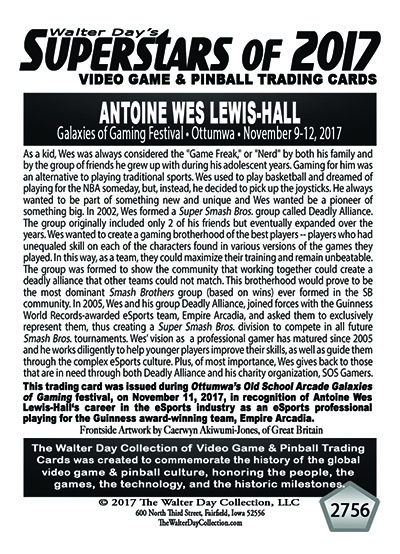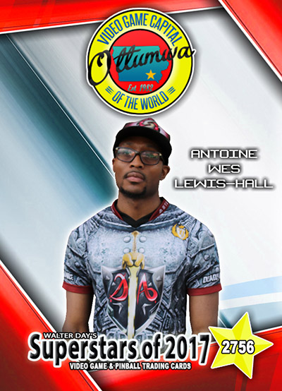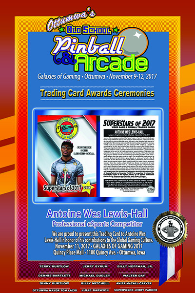 During the recent Ottumwa Trading Card Ceremonies, Antoine Wes Lewis-Hall was among an elite group of video game luminaries from Empire Arcadia who were honored on trading cards for their important contributions to the global gaming culture. Their trading cards were presented by Billy MItchell and Walter Day -- along with the AWARD CERTIFICATE shown below -- on Saturday, November 11, 2017, during the Ottumwa Old School Arcade Galaxies of Gaming Festival, at the Quincy Place Mall, in Ottumwa, Iowa. To see the other trading cards unveiled during this ceremony -- or to see the long chronological history of the TRADING CARDS AWARDS TRADITION, go to this link: Chronological History of the Trading Card Awards Ceremonies