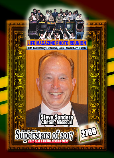 During the recent Ottumwa Trading Card Ceremonies, Steve Sanders was among an elite group of video game luminaries who were honored on trading cards for their historic participation in the 1982 LIFE Magazine photoshoot. Returning to Ottumwa for the 35th-year reunion of the photo, they were honored with trading cards that were presented by Billy Mitchell and Walter Day along with the AWARD CERTIFICATE shown herein. (Steve Sanders was not present). They were presented on Saturday, November 11, 2017, during the Ottumwa Old School Arcade Galaxies of Gaming Festival, at the Quincy Place Mall, in Ottumwa, Iowa. To see the other trading cards unveiled during this ceremony -- or to see the long chronological history of the TRADING CARDS AWARDS TRADITION, go to this link: Chronological History of the Trading Card Awards Ceremonies