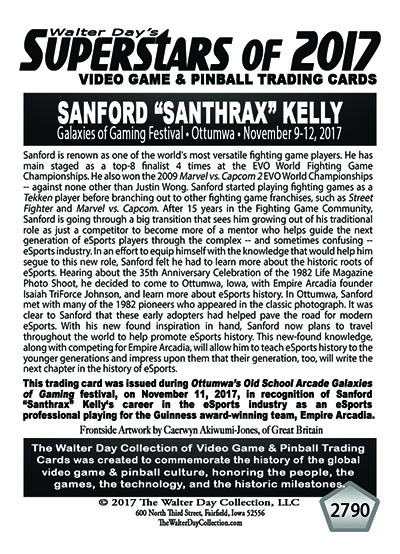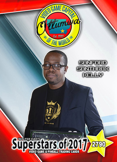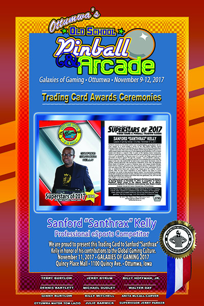 During the recent Ottumwa Trading Card Ceremonies, Sanford "Santhrax" Kelly was among an elite group of video game luminaries from Empire Arcadia who were honored on trading cards for their important contributions to the global gaming culture. Their trading cards were presented by Billy MItchell and Walter Day -- along with the AWARD CERTIFICATE shown below -- on Saturday, November 11, 2017, during the Ottumwa Old School Arcade Galaxies of Gaming Festival, at the Quincy Place Mall, in Ottumwa, Iowa. To see the other trading cards unveiled during this ceremony -- or to see the long chronological history of the TRADING CARDS AWARDS TRADITION, go to this link: Chronological History of the Trading Card Awards Ceremonies
