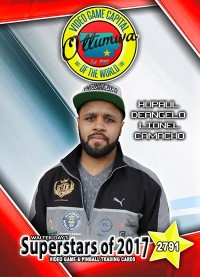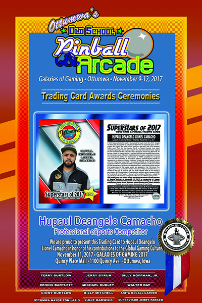 During the recent Ottumwa Trading Card Ceremonies, Hupaul Deangelo Lionel Camacho was among an elite group of video game luminaries from Empire Arcadia who were honored on trading cards for their important contributions to the global gaming culture. Their trading cards were presented by Billy MItchell and Walter Day -- along with the AWARD CERTIFICATE shown below -- on Saturday, November 11, 2017, during the Ottumwa Old School Arcade Galaxies of Gaming Festival, at the Quincy Place Mall, in Ottumwa, Iowa. To see the other trading cards unveiled during this ceremony -- or to see the long chronological history of the TRADING CARDS AWARDS TRADITION, go to this link: Chronological History of the Trading Card Awards Ceremonies