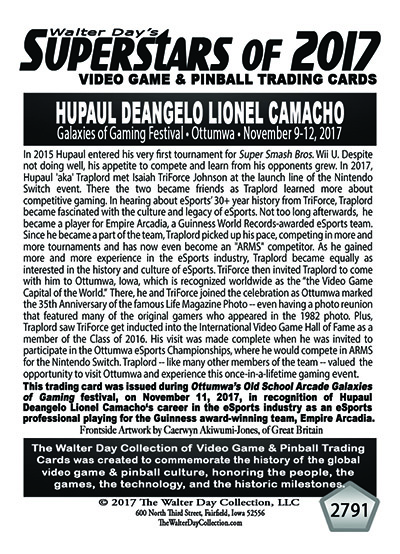 In 2015 Hupaul entered his very first tournament for Super Smash Bros. Wii U. Despite not doing well, his appetite to compete and learn from his opponents grew. In 2017, Hupaul 'aka' Traplord met Isaiah TriForce Johnson at the launch line of the Nintendo Switch event. There the two became friends as Traplord learned more about competitive gaming. In hearing about eSports’ 30+ year history from TriForce, Traplord became fascinated with the culture and legacy of eSports. Not too long afterwards, he became a player for Empire Arcadia, a Guinness World Records-awarded eSports team. Since he became a part of the team, Traplord picked up his pace, competing in more and more tournaments and has now even become an "ARMS" competitor. As he gained more and more experience in the eSports industry, Traplord became equally as interested in the history and culture of eSports. TriForce then invited Traplord to come with him to Ottumwa, Iowa, which is recognized worldwide as the “the Video Game Capital of the World.” There, he and TriForce joined the celebration as Ottumwa marked the 35th Anniversary of the famous Life Magazine Photo -- even having a photo reunion that featured many of the original gamers who appeared in the 1982 photo. Plus, Traplord saw TriForce get inducted into the International Video Game Hall of Fame as a member of the Class of 2016. His visit was made complete when he was invited to participate in the Ottumwa eSports Championships, where he would compete in ARMS for the Nintendo Switch. Traplord -- like many other members of the team -- valued the opportunity to visit Ottumwa and experience this once-in-a-lifetime gaming event. • Trading Card artwork by Caerwyn Akiwumi-Jones