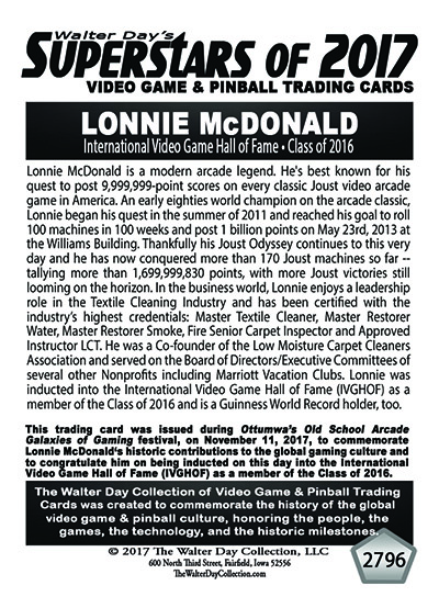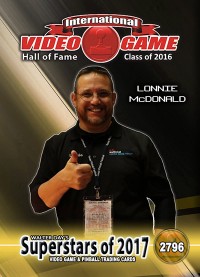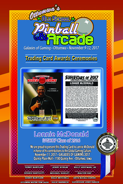 During the recent Ottumwa Trading Card Ceremonies, Lonnie McDonald was among an elite group of video game luminaries who were inducted into the International Video Game Hall of Fame (IVGHOF) Class of 2016, and were also honored on trading cards for their important contributions to the global gaming culture. Presented by Billy MItchell and Walter Day, the trading card was unveiled -- along with an AWARD CERTIFICATE shown herein -- on Saturday, November 11, 2017, during the Ottumwa Old School Arcade Galaxies of Gaming Festival, at the Quincy Place Mall, in Ottumwa, Iowa. To see the other trading cards unveiled during this ceremony -- or to see the long chronological history of the TRADING CARDS AWARDS TRADITION, go to this link: Chronological History of the Trading Card Awards Ceremonies