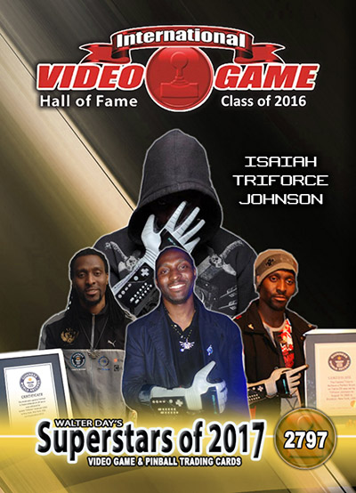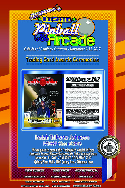 During the recent Ottumwa Trading Card Ceremonies, Isaiah TriForce Johnson was among an elite group of video game luminaries who were inducted into the International Video Game Hall of Fame (IVGHOF) Class of 2016, and were also honored on trading cards for their important contributions to the global gaming culture. Presented by Billy MItchell and Walter Day, the trading card was unveiled -- along with an AWARD CERTIFICATE shown herein -- on Saturday, November 11, 2017, during the Ottumwa Old School Arcade Galaxies of Gaming Festival, at the Quincy Place Mall, in Ottumwa, Iowa. To see the other trading cards unveiled during this ceremony -- or to see the long chronological history of the TRADING CARDS AWARDS TRADITION, go to this link: Chronological History of the Trading Card Awards Ceremonies