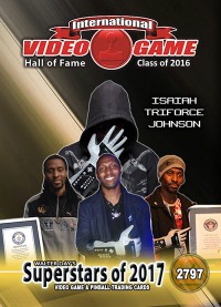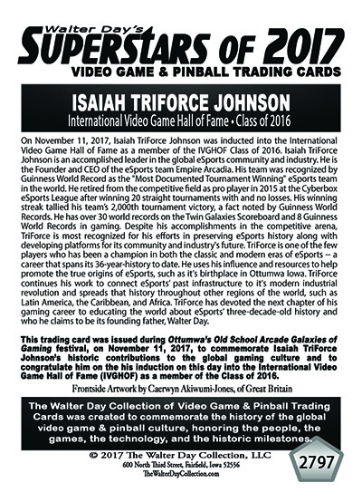 On November 11, 2017, Isaiah TriForce Johnson was inducted into the International Video Game Hall of Fame as a member of the IVGHOF Class of 2016. Isaiah TriForce Johnson is an accomplished leader in the global eSports community and industry. He is the Founder and CEO of the eSports team Empire Arcadia. His team was recognized by Guinness World Record as the "Most Documented Tournament Winning" eSports team in the world. He retired from the competitive field as pro player in 2015 at the Cyberbox eSports League after winning 20 straight tournaments with and no losses. His winning streak tallied his team’s 2,000th tournament victory, a fact noted by Guinness World Records. He has over 30 world records on the Twin Galaxies Scoreboard and 8 Guinness World Records in gaming. Despite his accomplishments in the competitive arena, TriForce is most recognized for his efforts in preserving eSports history along with developing platforms for its community and industry's future. TriForce is one of the few players who has been a champion in both the classic and modern eras of eSports -- a career that spans its 36-year-history to date. He uses his influence and resources to help promote the true origins of eSports, such as it's birthplace in Ottumwa Iowa. TriForce continues his work to connect eSports’ past infrastructure to it's modern industrial revolution and spreads that history throughout other regions of the world, such as Latin America, the Caribbean, and Africa. TriForce has devoted the next chapter of his gaming career to educating the world about eSports’ three-decade-old history and who he claims to be its founding father, Walter Day. Trading Card artwork by Caerwyn Akiwumi-Jones