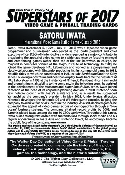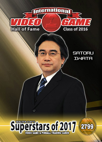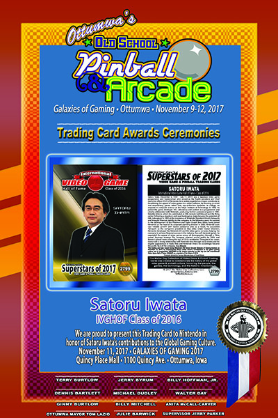 During the recent Ottumwa Trading Card Ceremonies, Satoru Iwata was among an elite group of video game luminaries who were inducted into the International Video Game Hall of Fame (IVGHOF) Class of 2016, and were also honored on trading cards for their important contributions to the global gaming culture. Presented by Billy MItchell and Walter Day, the trading card was unveiled -- along with an AWARD CERTIFICATE shown herein -- on Saturday, November 11, 2017, during the Ottumwa Old School Arcade Galaxies of Gaming Festival, at the Quincy Place Mall, in Ottumwa, Iowa. To see the other trading cards unveiled during this ceremony -- or to see the long chronological history of the TRADING CARDS AWARDS TRADITION, go to this link: Chronological History of the Trading Card Awards Ceremonies