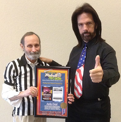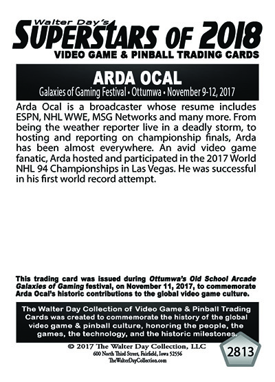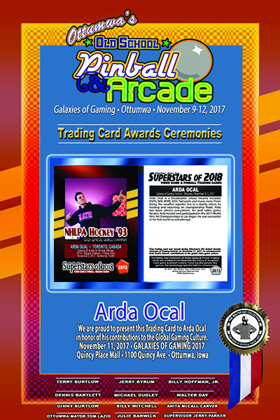 During the recent Ottumwa Trading Card Ceremonies, Arda Ocal was among an elite group of video game journalists who were honored on trading cards for their important contributions to the global gaming culture. Presented by Billy MItchell and Walter Day, the trading card was unveiled -- along with an AWARD CERTIFICATE shown herein -- on Saturday, November 11, 2017, during the Ottumwa Old School Arcade Galaxies of Gaming Festival, at the Quincy Place Mall, in Ottumwa, Iowa.