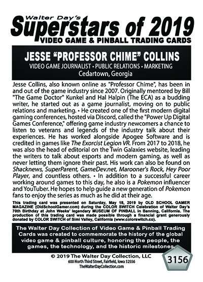 This trading card was presented on Saturday, May 18, 2019 by OLD SCHOOL GAMER MAGAZINE (OldSchoolGamer.com) during the COLOR SWITCH Celebration of Walter Day's 70th birthday at John Weeks' legendary MUSEUM OF PINBALL in Banning, California. The production of this trading card was made possible through a financial grant generously donated by COLOR SWITCH of San Francisco, California (www.colorswitch.com).