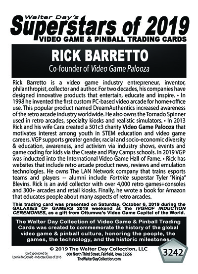 This trading card and trading card award were unveiled on Saturday, October 6, 2019 during Ottumwa's Galaxies of Gaming video game festival, which was a part of the IVGHOF 2019 Induction Ceremonies.
