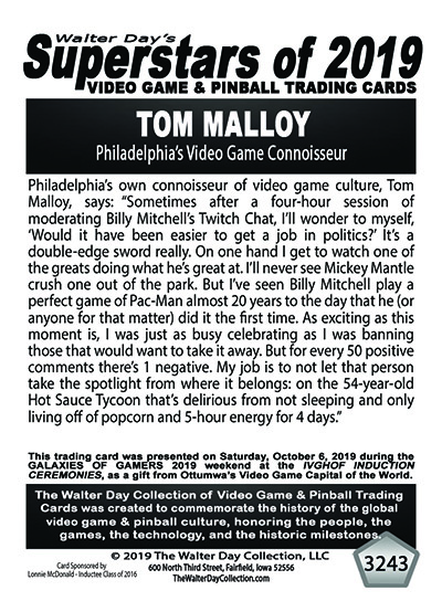 This trading card and trading card award were unveiled on Saturday, October 6, 2019 during Ottumwa's Galaxies of Gaming video game festival, which was a part of the IVGHOF 2019 Induction Ceremonies.