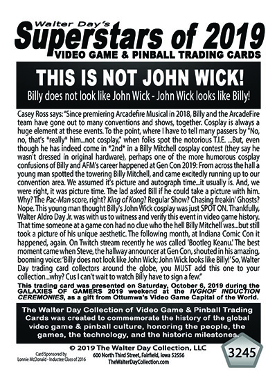 This trading card and trading card award were unveiled on Saturday, October 6, 2019 during Ottumwa's Galaxies of Gaming video game festival, which was a part of the IVGHOF 2019 Induction Ceremonies.