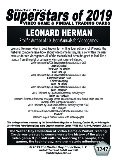 This trading card and trading card award were presented as a gift from Old School Gamer Magazine (oldschoolgamermagazine.com) on Saturday, October 19, 2019 during the 2019 Portland Retro Gaming Expo.