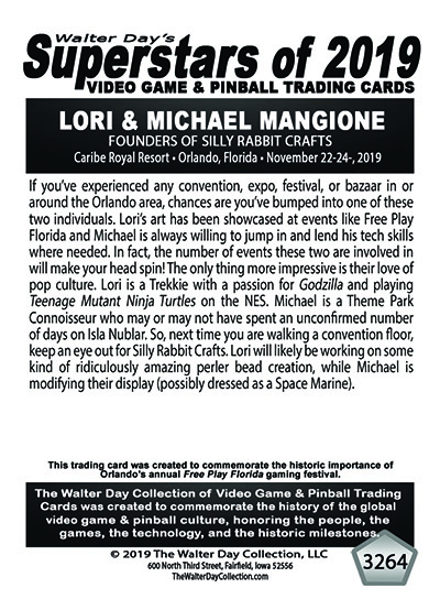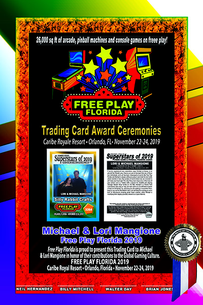 This trading card and trading card award were presented on Saturday, November 23, 2019 during the 2019 FREE PLAY FLORIDA gaming festival, at the Caribe Royale Resort, in Orlando, Florida.