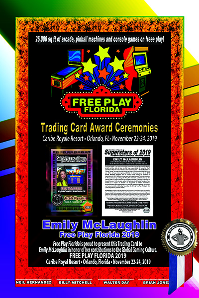 This trading card and trading card award were presented on Saturday, November 23, 2019 during the 2019 FREE PLAY FLORIDA gaming festival, at the Caribe Royale Resort, in Orlando, Florida.