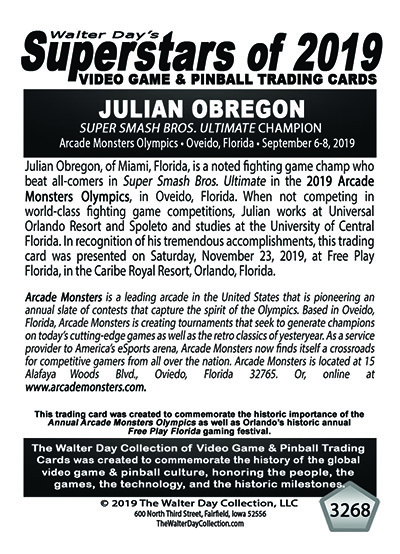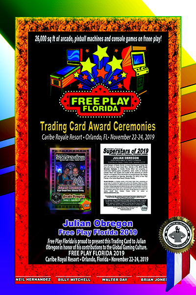This trading card and trading card award were presented on Saturday, November 23, 2019 during the 2019 FREE PLAY FLORIDA gaming festival, at the Caribe Royale Resort, in Orlando, Florida.