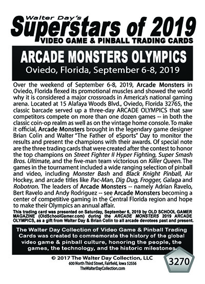 This trading card and trading card award were presented on Saturday, November 23, 2019 during the 2019 FREE PLAY FLORIDA gaming festival, at the Caribe Royale Resort, in Orlando, Florida.