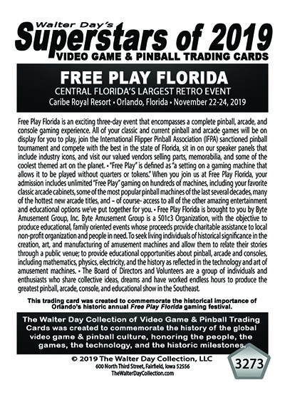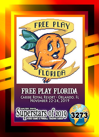 This trading card and trading card award were presented on Saturday, November 23, 2019 during the 2019 FREE PLAY FLORIDA gaming festival, at the Caribe Royale Resort, in Orlando, Florida.