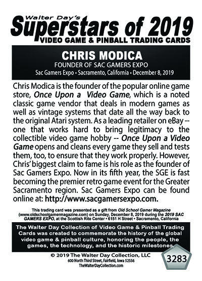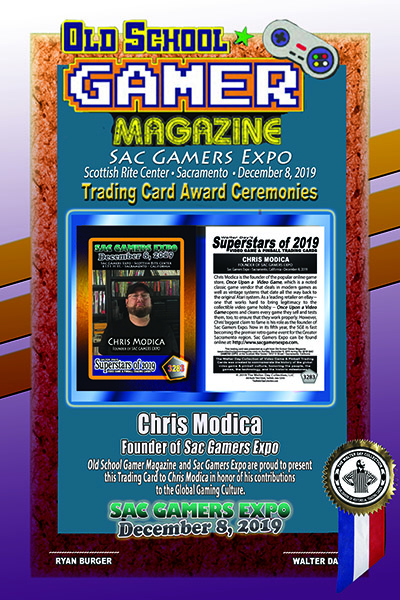 This trading card and trading card award were presented on Sunday, December 8, 2019 to Chris Modica who is recognized as an important contributor to the global video game culture. The card and award were created as a gift from OLD SCHOOL GAMER MAGAZINE (OldSchoolGamer.com) and presented during the 2019 SAC GAMERS EXPO, at the Scottish Rite Center in Sacramento, California.