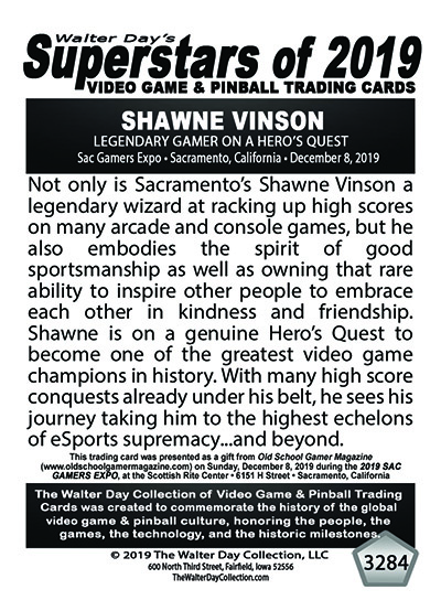 This trading card and trading card award were presented by Chris Modica on Sunday, December 8, 2019 to this deserving recipient who is recognized as an important contributor to the global video game culture. The card and award were created as a gift from OLD SCHOOL GAMER MAGAZINE (OldSchoolGamer.com) and presented during the 2019 SAC GAMERS EXPO, at the Scottish Rite Center in Sacramento, California.