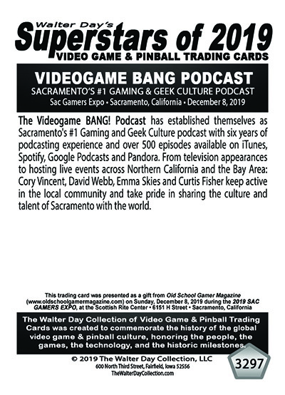 This trading card and trading card award were presented by Chris Modica on Sunday, December 8, 2019 to this deserving recipient who is recognized as an important contributor to the global video game culture. The card and award were created as a gift from OLD SCHOOL GAMER MAGAZINE (OldSchoolGamer.com) and presented during the 2019 SAC GAMERS EXPO, at the Scottish Rite Center in Sacramento, California.