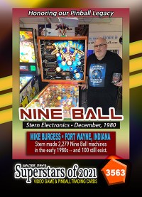A subset of the Superstars of 2021, Our Pinball Legacy series of trading cards celebrates the 90th anniversary of the birth of coin-operated pinball (1931-2021). To honor this tremendous legacy, we invited more than 400 pinball aficianados to pose with their favorite pinball game for a trading card. And, on the back of the card, they wrote a 150-200 word biography, telling the story of their love for pinball while including in the text historical facts about the machine.