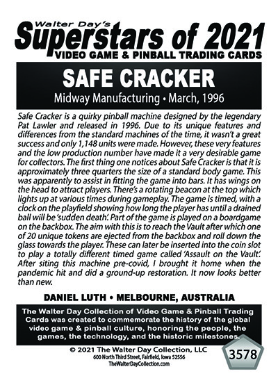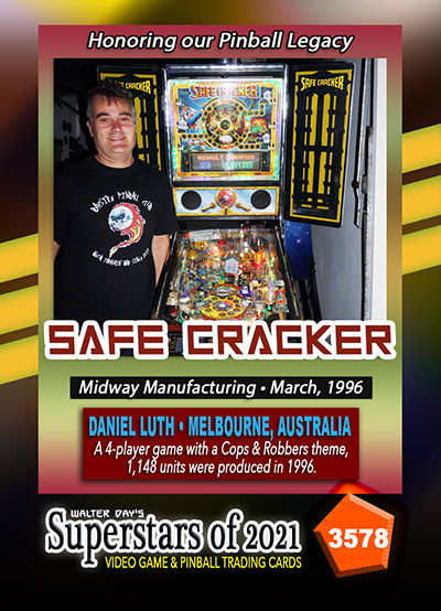 A subset of the Superstars of 2021, Our Pinball Legacy series of trading cards celebrates the 90th anniversary of the birth of coin-operated pinball (1931-2021). To honor this tremendous legacy, we invited more than 400 pinball aficianados to pose with their favorite pinball game for a trading card. And, on the back of the card, they wrote a 150-200 word biography, telling the story of their love for pinball while including in the text historical facts about the machine.