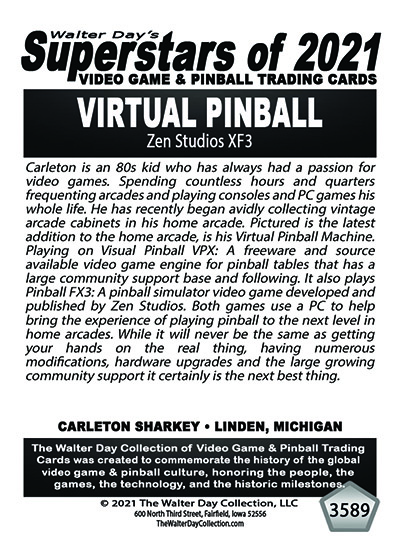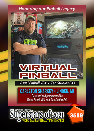 A subset of the Superstars of 2021, Our Pinball Legacy series of trading cards celebrates the 90th anniversary of the birth of coin-operated pinball (1931-2021). To honor this tremendous legacy, we invited more than 400 pinball aficianados to pose with their favorite pinball game for a trading card. And, on the back of the card, they wrote a 150-200 word biography, telling the story of their love for pinball while including in the text historical facts about the machine.