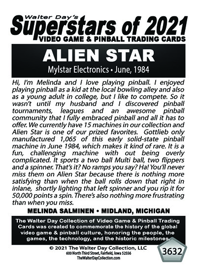 A subset of the Superstars of 2021, Our Pinball Legacy series of trading cards celebrates the 90th anniversary of the birth of coin-operated pinball (1931-2021). To honor this tremendous legacy, we invited more than 400 pinball aficianados to pose with their favorite pinball game for a trading card. And, on the back of the card, they wrote a 150-200 word biography, telling the story of their love for pinball while including in the text historical facts about the machine.