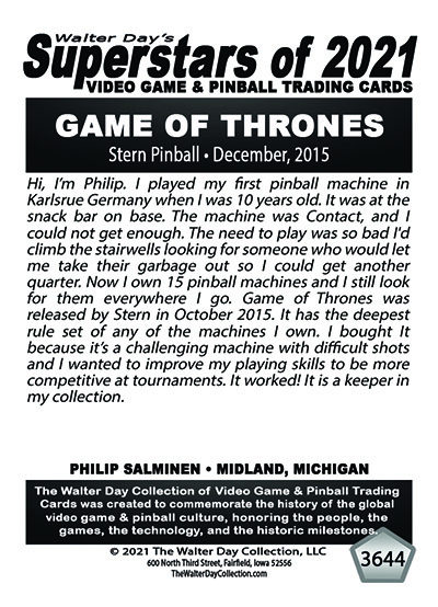 A subset of the Superstars of 2021, Our Pinball Legacy series of trading cards celebrates the 90th anniversary of the birth of coin-operated pinball (1931-2021). To honor this tremendous legacy, we invited more than 400 pinball aficianados to pose with their favorite pinball game for a trading card. And, on the back of the card, they wrote a 150-200 word biography, telling the story of their love for pinball while including in the text historical facts about the machine.