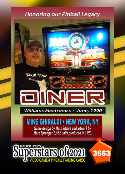 A subset of the Superstars of 2021, Our Pinball Legacy series of trading cards celebrates the 90th anniversary of the birth of coin-operated pinball (1931-2021). To honor this tremendous legacy, we invited more than 400 pinball aficianados to pose with their favorite pinball game for a trading card. And, on the back of the card, they wrote a 150-200 word biography, telling the story of their love for pinball while including in the text historical facts about the machine.
