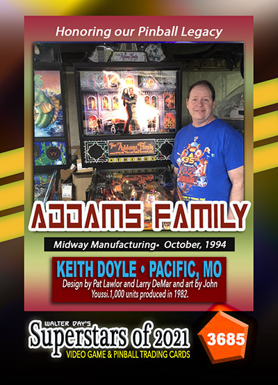 A subset of the Superstars of 2021, Our Pinball Legacy series of trading cards celebrates the 90th anniversary of the birth of coin-operated pinball (1931-2021). To honor this tremendous legacy, we invited more than 400 pinball aficianados to pose with their favorite pinball game for a trading card. And, on the back of the card, they wrote a 150-200 word biography, telling the story of their love for pinball while including in the text historical facts about the machine.