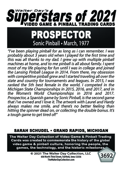 A subset of the Superstars of 2021, Our Pinball Legacy series of trading cards celebrates the 90th anniversary of the birth of coin-operated pinball (1931-2021). To honor this tremendous legacy, we invited more than 400 pinball aficianados to pose with their favorite pinball game for a trading card. And, on the back of the card, they wrote a 150-200 word biography, telling the story of their love for pinball while including in the text historical facts about the machine.