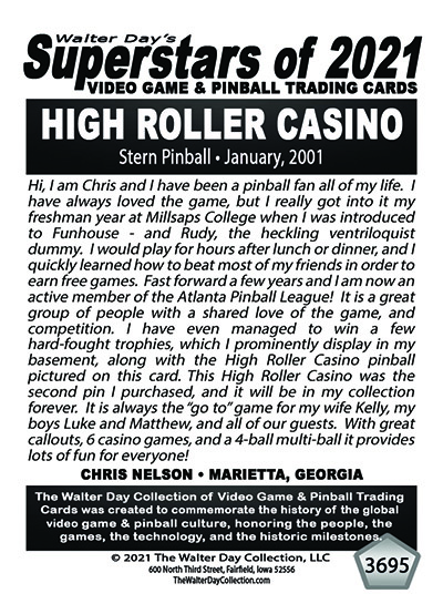 A subset of the Superstars of 2021, Our Pinball Legacy series of trading cards celebrates the 90th anniversary of the birth of coin-operated pinball (1931-2021). To honor this tremendous legacy, we invited more than 400 pinball aficianados to pose with their favorite pinball game for a trading card. And, on the back of the card, they wrote a 150-200 word biography, telling the story of their love for pinball while including in the text historical facts about the machine.