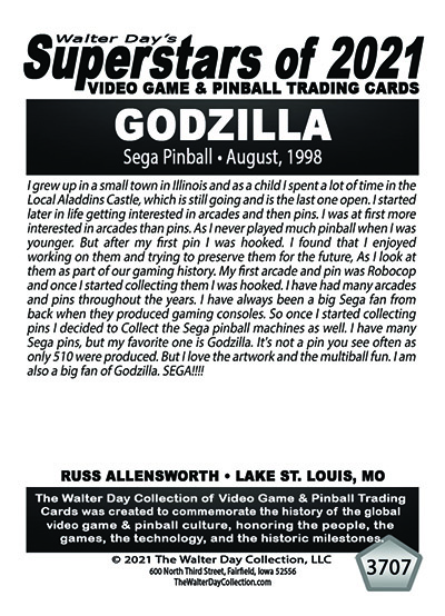 A subset of the Superstars of 2021, Our Pinball Legacy series of trading cards celebrates the 90th anniversary of the birth of coin-operated pinball (1931-2021). To honor this tremendous legacy, we invited more than 400 pinball aficianados to pose with their favorite pinball game for a trading card. And, on the back of the card, they wrote a 150-200 word biography, telling the story of their love for pinball while including in the text historical facts about the machine.