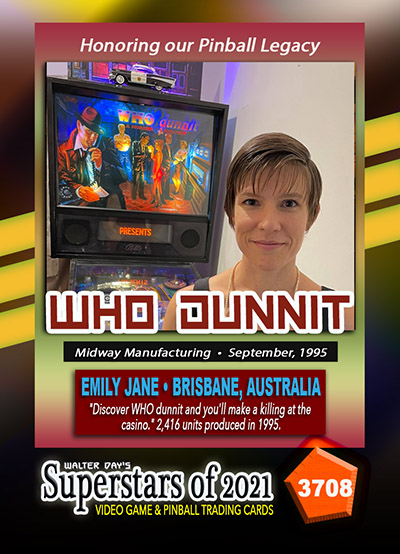A subset of the Superstars of 2021, Our Pinball Legacy series of trading cards celebrates the 90th anniversary of the birth of coin-operated pinball (1931-2021). To honor this tremendous legacy, we invited more than 400 pinball aficianados to pose with their favorite pinball game for a trading card. And, on the back of the card, they wrote a 150-200 word biography, telling the story of their love for pinball while including in the text historical facts about the machine.