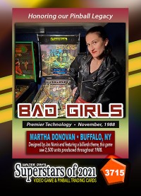 A subset of the Superstars of 2021, Our Pinball Legacy series of trading cards celebrates the 90th anniversary of the birth of coin-operated pinball (1931-2021). To honor this tremendous legacy, we invited more than 400 pinball aficianados to pose with their favorite pinball game for a trading card. And, on the back of the card, they wrote a 150-200 word biography, telling the story of their love for pinball while including in the text historical facts about the machine.