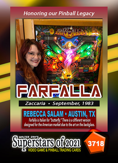 A subset of the Superstars of 2021, Our Pinball Legacy series of trading cards celebrates the 90th anniversary of the birth of coin-operated pinball (1931-2021). To honor this tremendous legacy, we invited more than 400 pinball aficianados to pose with their favorite pinball game for a trading card. And, on the back of the card, they wrote a 150-200 word biography, telling the story of their love for pinball while including in the text historical facts about the machine.