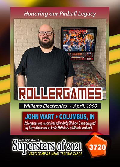 A subset of the Superstars of 2021, Our Pinball Legacy series of trading cards celebrates the 90th anniversary of the birth of coin-operated pinball (1931-2021). To honor this tremendous legacy, we invited more than 400 pinball aficianados to pose with their favorite pinball game for a trading card. And, on the back of the card, they wrote a 150-200 word biography, telling the story of their love for pinball while including in the text historical facts about the machine.