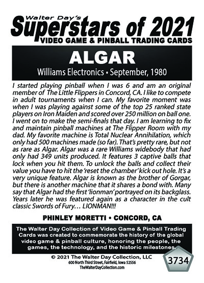 A subset of the Superstars of 2021, Our Pinball Legacy series of trading cards celebrates the 90th anniversary of the birth of coin-operated pinball (1931-2021). To honor this tremendous legacy, we invited more than 400 pinball aficianados to pose with their favorite pinball game for a trading card. And, on the back of the card, they wrote a 150-200 word biography, telling the story of their love for pinball while including in the text historical facts about the machine.