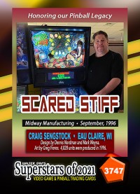 A subset of the Superstars of 2021, Our Pinball Legacy series of trading cards celebrates the 90th anniversary of the birth of coin-operated pinball (1931-2021). To honor this tremendous legacy, we invited more than 400 pinball aficianados to pose with their favorite pinball game for a trading card. And, on the back of the card, they wrote a 150-200 word biography, telling the story of their love for pinball while including in the text historical facts about the machine.